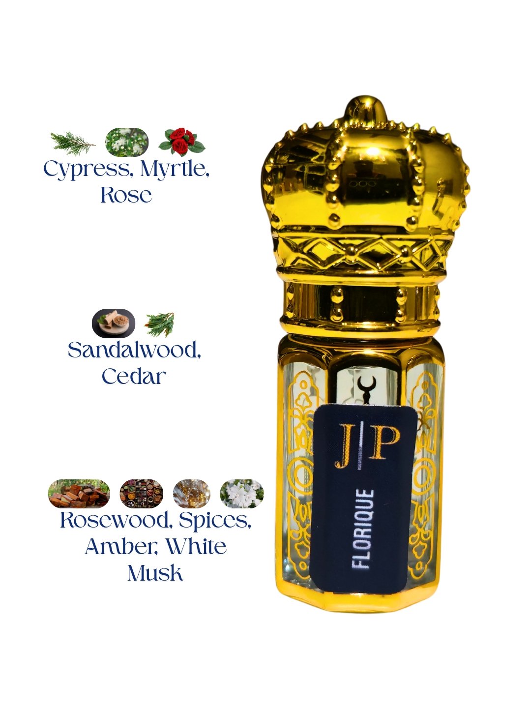 At the heart of this Florique romantic attar, the creamy richness of sandalwood and smooth cedar unveils a depth that enhances its velvety aura. This woody core beautifully clings to the skin and fabric, ensuring the attar remains captivating throughout the day or night. As Florique reaches its deeper layers, the base notes of rosewood, spices, amber, and white musk create a sensual trail of warmth, adding complexity and refinement to its overall appeal. Balanced with floral, woody, and musky tones, this attar is the ideal companion for romantic evenings, formal gatherings, and celebrations.